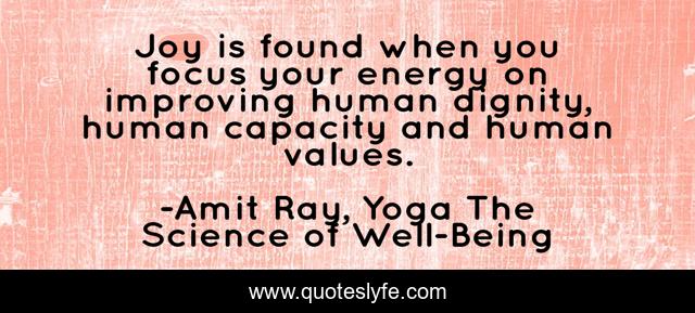 This page presents the quote "Joy is found when you focus your energy on improving human dignity, human capacity and human values.". Author of this quote is Amit Ray, Yoga The Science of Well-Being. This quote is about yoga-values, human-capacity, human-rights, humanity-yoga, yoga, human-values, human-dignity,.