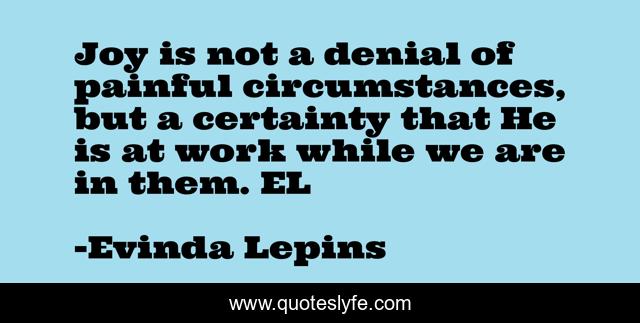 This page presents the quote "Joy is not a denial of painful circumstances, but a certainty that He is at work while we are in them. EL". Author of this quote is Evinda Lepins. This quote is about joy, denial, painful-circumstances,.