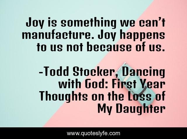 This page presents the quote "Joy is something we can’t manufacture. Joy happens to us not because of us.". Author of this quote is Todd Stocker, Dancing with God: First Year Thoughts on the Loss of My Daughter. This quote is about joy-of-life, joy,.