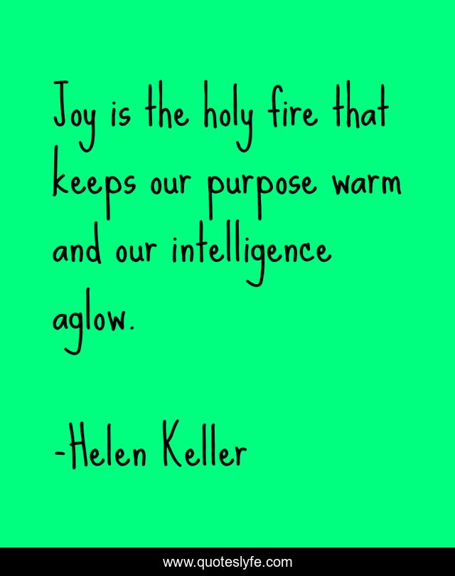 This page presents the quote "Joy is the holy fire that keeps our purpose warm and our intelligence aglow.". Author of this quote is Helen Keller. This quote is about joy, purpose, happiness,.