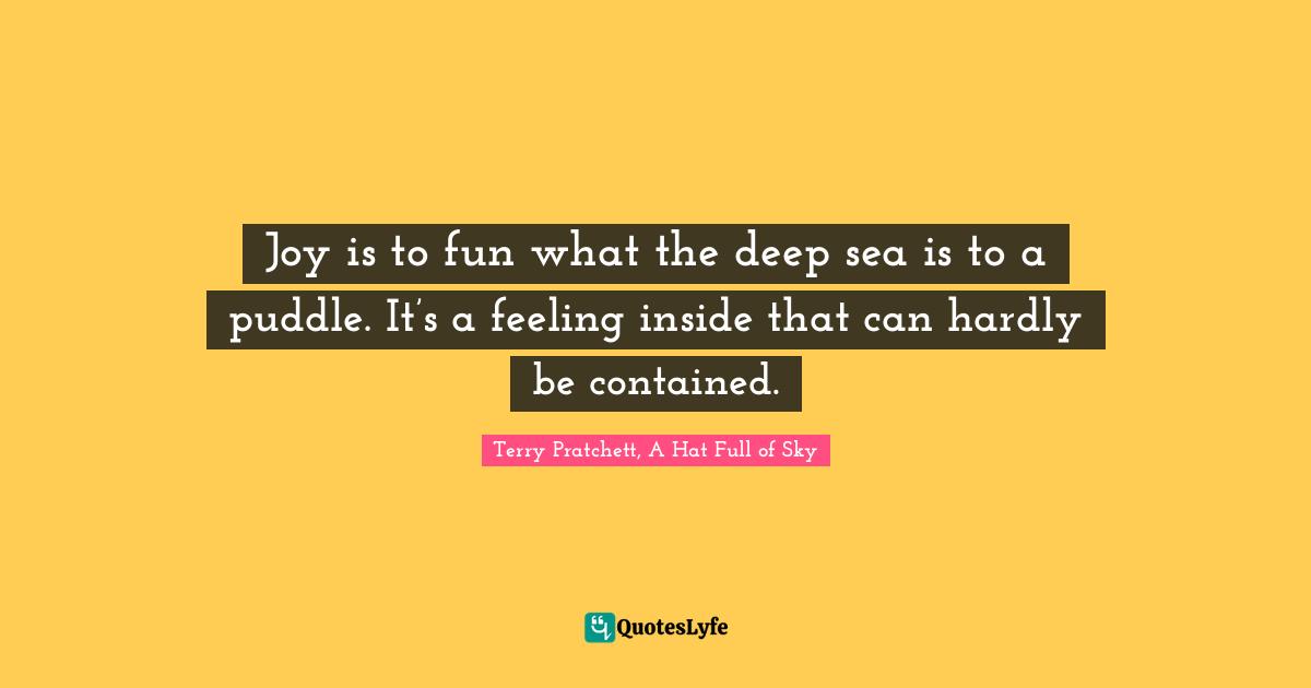 This page presents the quote "Joy is to fun what the deep sea is to a puddle. It’s a feeling inside that can hardly be contained.". Author of this quote is Terry Pratchett, A Hat Full of Sky. This quote is about joy, analogy,.