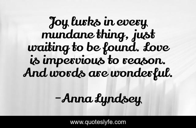 This page presents the quote "Joy lurks in every mundane thing, just waiting to be found. Love is impervious to reason. And words are wonderful.". Author of this quote is Anna Lyndsey. This quote is about love, lust-for-life, appreciation, meaning, words, affection,.