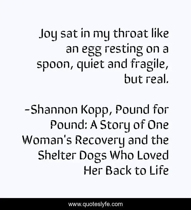 This page presents the quote "Joy sat in my throat like an egg resting on a spoon, quiet and fragile, but real.". Author of this quote is Shannon Kopp, Pound for Pound: A Story of One Woman's Recovery and the Shelter Dogs Who Loved Her Back to Life. This quote is about joy, recovery, happiness, shelter-dogs,.