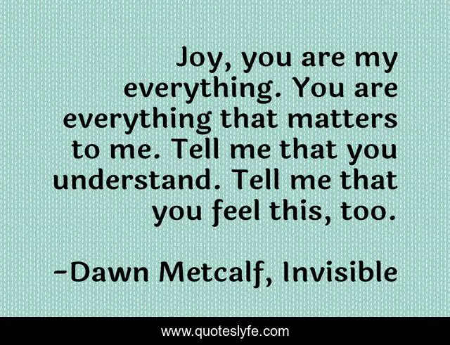 This page presents the quote "Joy, you are my everything. You are everything that matters to me. Tell me that you understand. Tell me that you feel this, too.". Author of this quote is Dawn Metcalf, Invisible. This quote is about invisible, ink-to-joy, the-twixt, ink, joy,.