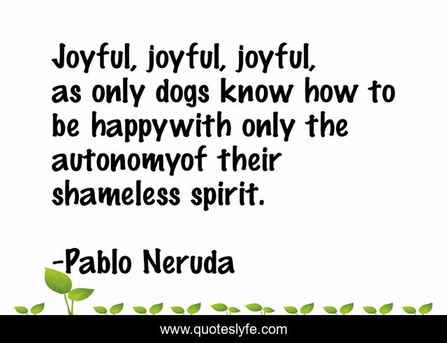 This page presents the quote "Joyful, joyful, joyful, as only dogs know how to be happywith only the autonomyof their shameless spirit.". Author of this quote is Pablo Neruda. This quote is about love, dogs, affection,.