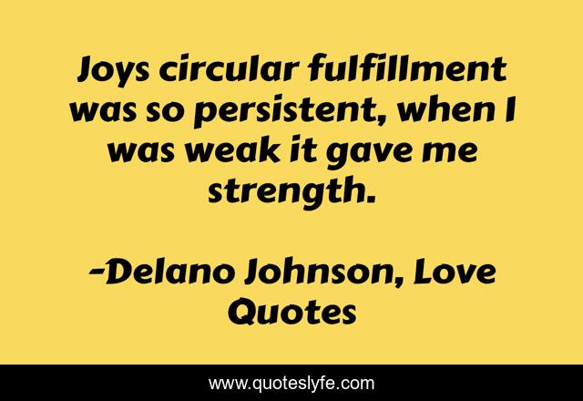 This page presents the quote "Joys circular fulfillment was so persistent, when I was weak it gave me strength.". Author of this quote is Delano Johnson, Love Quotes. This quote is about love-hurts, lovers, love, delano-johnson, daydream, cinderella, love-at-first-sight, rare-images-of-love, fantasy,.