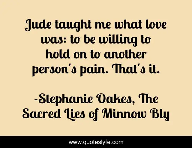 This page presents the quote "Jude taught me what love was: to be willing to hold on to another person's pain. That's it.". Author of this quote is Stephanie Oakes, The Sacred Lies of Minnow Bly. This quote is about love, pain, humanity, affection,.