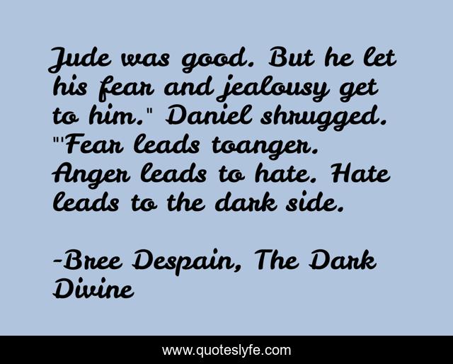 This page presents the quote "Jude was good. But he let his fear and jealousy get to him." Daniel shrugged. "'Fear leads toanger. Anger leads to hate. Hate leads to the dark side.". Author of this quote is Bree Despain, The Dark Divine. This quote is about jude, bree-despain, daniel, dark-divine, anger, fear, hate,.