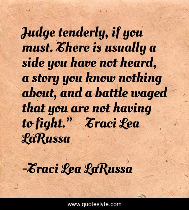 Judge tenderly, if you must. There is usually a side you have not heard, a story you know nothing about, and a battle waged that you are not having to fight.” ― Traci Lea LaRussa