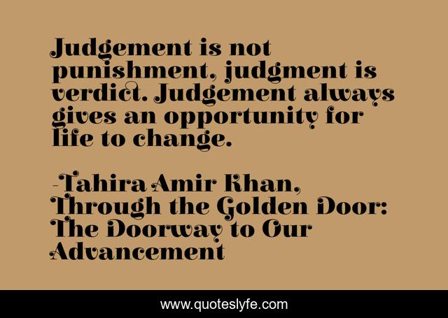 This page presents the quote "Judgement is not punishment, judgment is verdict. Judgement always gives an opportunity for life to change.". Author of this quote is Tahira Amir Khan, Through the Golden Door: The Doorway to Our Advancement. .