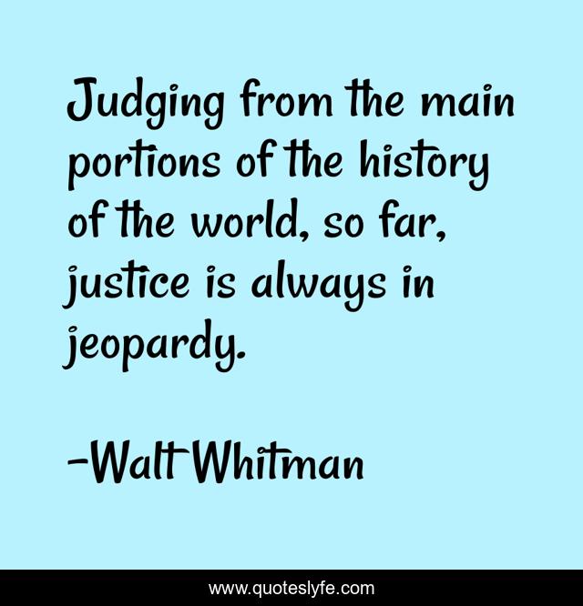 This page presents the quote "Judging from the main portions of the history of the world, so far, justice is always in jeopardy.". Author of this quote is Walt Whitman. This quote is about justice, world, judging,.