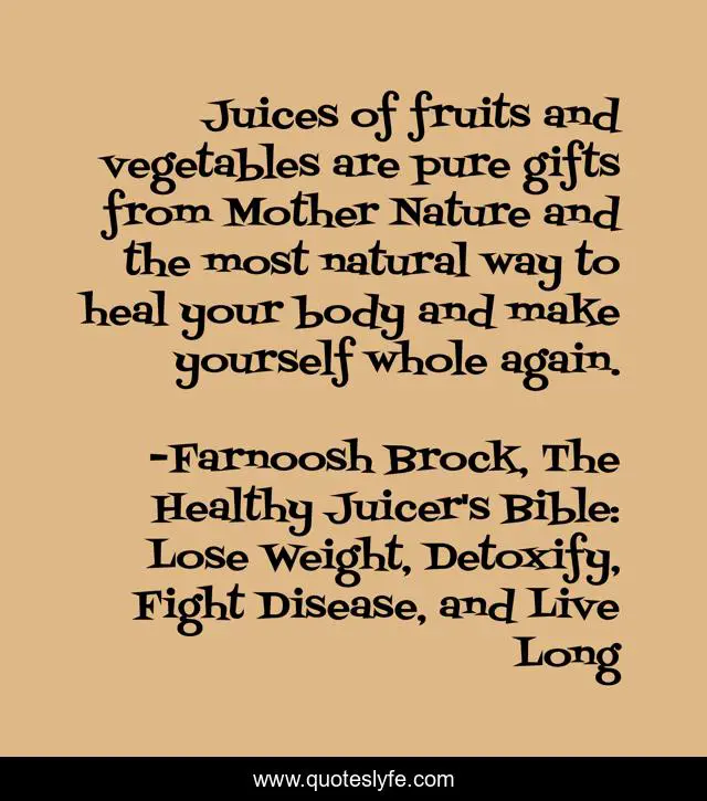 "Farnoosh Brock, The Healthy Juicer's Bible: Lose Weight, Detoxify, Fight Disease, and Live Long Quotes." Quoteslyfe.com, 2025. Mon. 08 Dec. 2025. <https://www.quoteslyfe.com/quote/Juices-of-fruits-and-vegetables-are-pure-253672>.