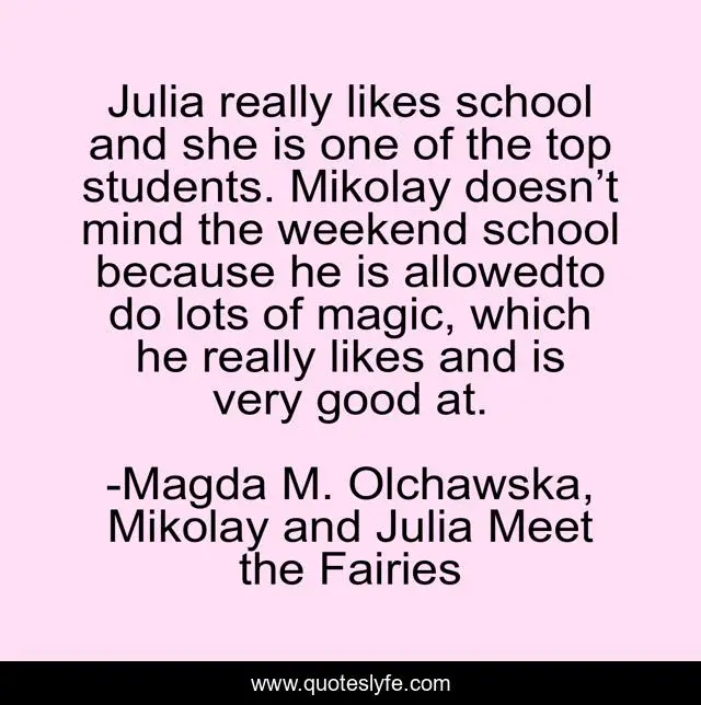 "Magda M. Olchawska, Mikolay and Julia Meet the Fairies Quotes." Quoteslyfe.com, 2025. Mon. 08 Dec. 2025. <https://www.quoteslyfe.com/quote/Julia-really-likes-school-and-she-is-99399>.