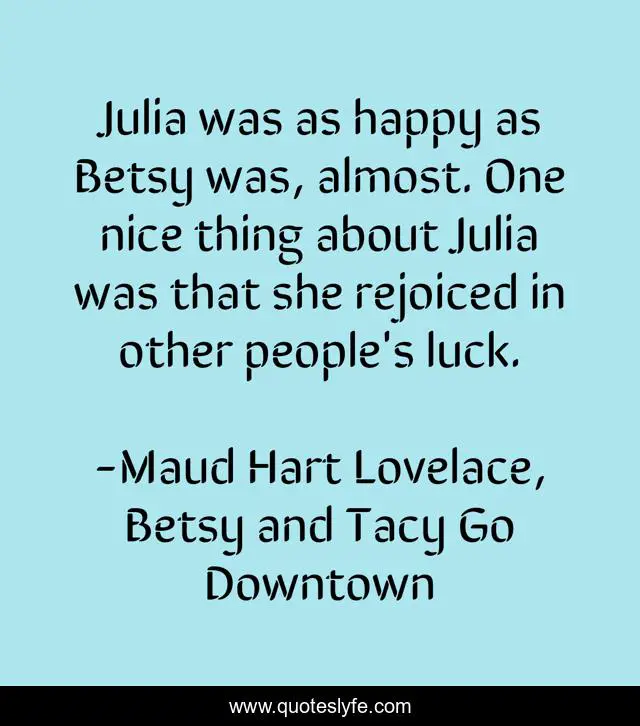 This page presents the quote "Julia was as happy as Betsy was, almost. One nice thing about Julia was that she rejoiced in other people's luck.". Author of this quote is Maud Hart Lovelace, Betsy and Tacy Go Downtown. This quote is about joy, happiness, others,.