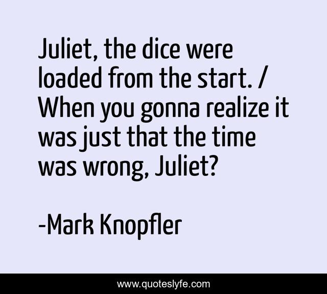 This page presents the quote "Juliet, the dice were loaded from the start. / When you gonna realize it was just that the time was wrong, Juliet?". Author of this quote is Mark Knopfler. This quote is about romeo-and-juliet, dire-straits, song, rock, song-lyrics, mark-knopfler, pop-rock,.