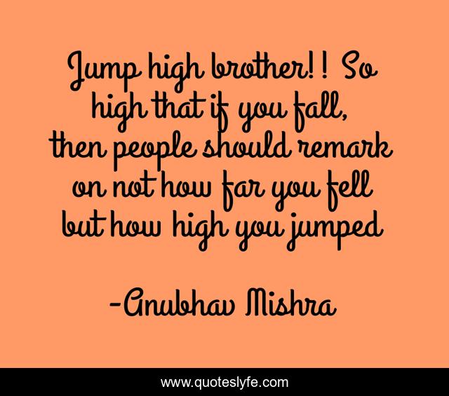 This page presents the quote "Jump high brother!! So high that if you fall, then people should remark on not how far you fell but how high you jumped". Author of this quote is Anubhav Mishra. This quote is about aim, aim-high, goals,.