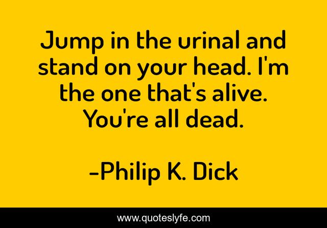 This page presents the quote "Jump in the urinal and stand on your head. I'm the one that's alive. You're all dead.". Author of this quote is Philip K. Dick. This quote is about death, illusion, reality,.