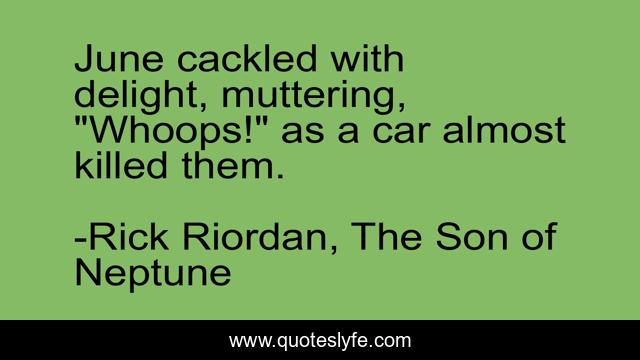 This page presents the quote "June cackled with delight, muttering, "Whoops!" as a car almost killed them.". Author of this quote is Rick Riordan, The Son of Neptune. This quote is about funny, humor, laugh-at-loud, rick-riordan, june, the-son-of-neptune, hilarious, comedy,.