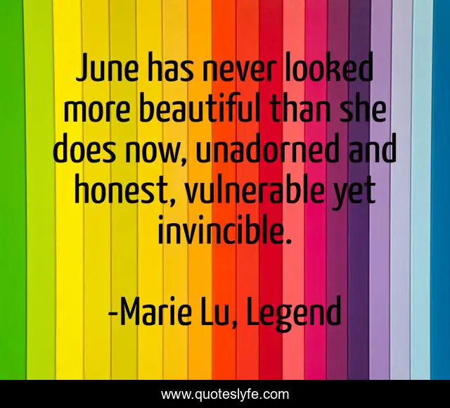 This page presents the quote "June has never looked more beautiful than she does now, unadorned and honest, vulnerable yet invincible.". Author of this quote is Marie Lu, Legend. This quote is about invincible, june, day, beauty, legend,.