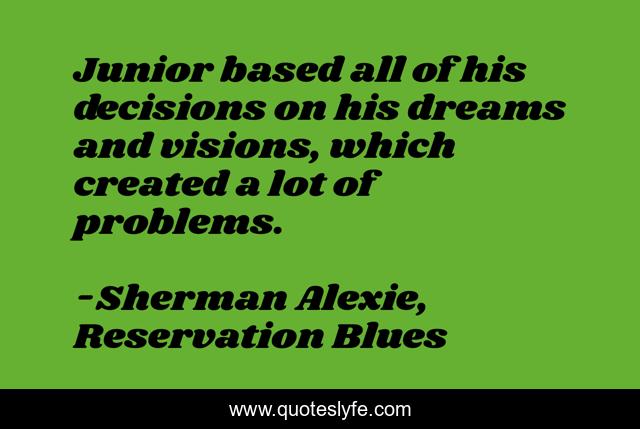 This page presents the quote "Junior based all of his decisions on his dreams and visions, which created a lot of problems.". Author of this quote is Sherman Alexie, Reservation Blues. This quote is about decisions, life, visions, dreams,.