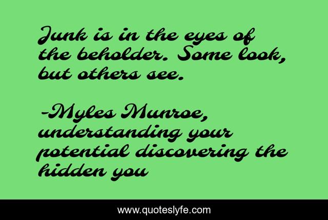 This page presents the quote "Junk is in the eyes of the beholder. Some look, but others see.". Author of this quote is Myles Munroe, understanding your potential discovering the hidden you. This quote is about behaviour, enthusiasm, attitude, potential, inspirational,.