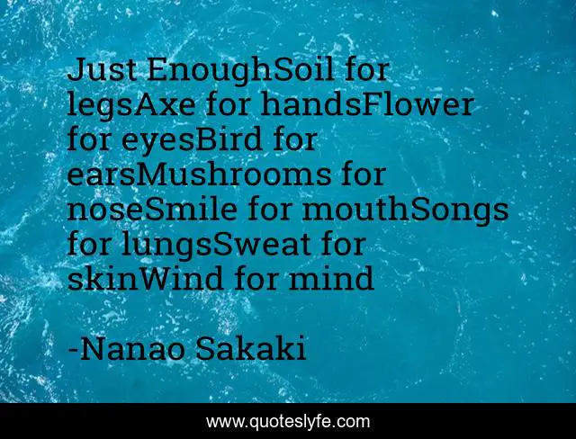 This page presents the quote "Just EnoughSoil for legsAxe for handsFlower for eyesBird for earsMushrooms for noseSmile for mouthSongs for lungsSweat for skinWind for mind". Author of this quote is Nanao Sakaki. .