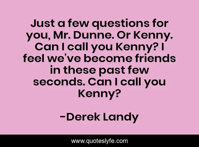 This page presents the quote "Just a few questions for you, Mr. Dunne. Or Kenny. Can I call you Kenny? I feel we've become friends in these past few seconds. Can I call you Kenny?". Author of this quote is Derek Landy. This quote is about funny, comedy, silly, humour, hilarious,.