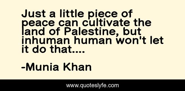 This page presents the quote "Just a little piece of peace can cultivate the land of Palestine, but inhuman human won't let it do that....". Author of this quote is Munia Khan. This quote is about land, inhuman, palestinian, inhumanity, peace, failure, human, palestine, cultivate,.