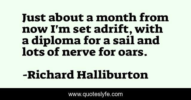 This page presents the quote "Just about a month from now I'm set adrift, with a diploma for a sail and lots of nerve for oars.". Author of this quote is Richard Halliburton. This quote is about direction, adrift, sailing, guts, graduation, water, humor, nerves, education,.