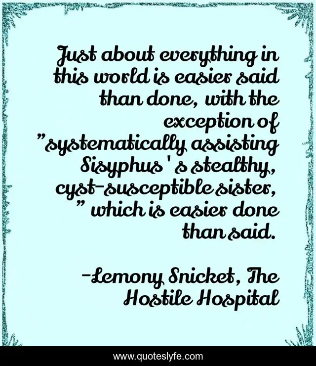 This page presents the quote "Just about everything in this world is easier said than done, with the exception of "systematically assisting Sisyphus's stealthy, cyst-susceptible sister, " which is easier done than said.". Author of this quote is Lemony Snicket, The Hostile Hospital. .
