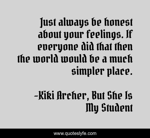 This page presents the quote "Just always be honest about your feelings. If everyone did that then the world would be a much simpler place.". Author of this quote is Kiki Archer, But She Is My Student. This quote is about lessons, life, kiki-archer, honesty, simple, feelings, complicated, world, but-she-is-my-student,.