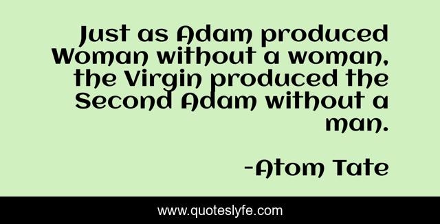 This page presents the quote "Just as Adam produced Woman without a woman, the Virgin produced the Second Adam without a man.". Author of this quote is Atom Tate. This quote is about woman, virgin-birth, creation, second-adam, son-of-man, man,.