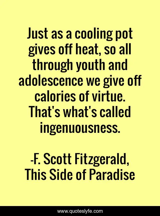 This page presents the quote "Just as a cooling pot gives off heat, so all through youth and adolescence we give off calories of virtue. That's what's called ingenuousness.". Author of this quote is F. Scott Fitzgerald, This Side of Paradise. This quote is about youth, ingenuity,.