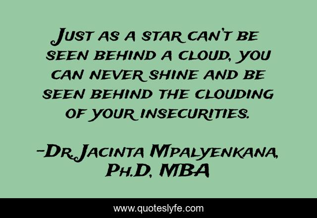 This page presents the quote "Just as a star can’t be seen behind a cloud, you can never shine and be seen behind the clouding of your insecurities.". Author of this quote is Dr. Jacinta Mpalyenkana, Ph.D, MBA. This quote is about shine-your-light, confidence-and-attitude, shine-your-star, purpose-of-life, self-esteem,.