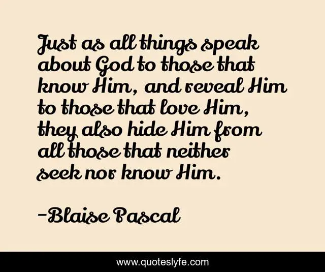 This page presents the quote "Just as all things speak about God to those that know Him, and reveal Him to those that love Him, they also hide Him from all those that neither seek nor know Him.". Author of this quote is Blaise Pascal. This quote is about christian, god, mathematicians, spirituality, pascal, student, blaise-pascal, mathematics, education,.