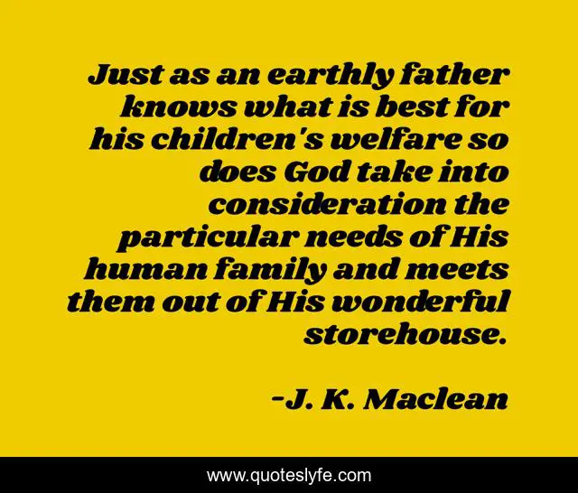 This page presents the quote "Just as an earthly father knows what is best for his children's welfare so does God take into consideration the particular needs of His human family and meets them out of His wonderful storehouse.". Author of this quote is J. K. Maclean. .