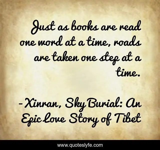 This page presents the quote "Just as books are read one word at a time, roads are taken one step at a time.". Author of this quote is Xinran, Sky Burial: An Epic Love Story of Tibet. This quote is about roads, books, encouragement,.
