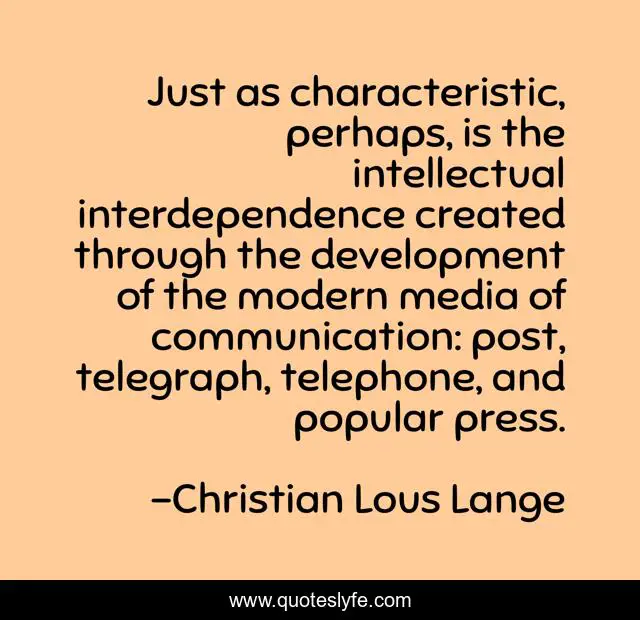 This page presents the quote "Just as characteristic, perhaps, is the intellectual interdependence created through the development of the modern media of communication: post, telegraph, telephone, and popular press.". Author of this quote is Christian Lous Lange. This quote is about development, media,.