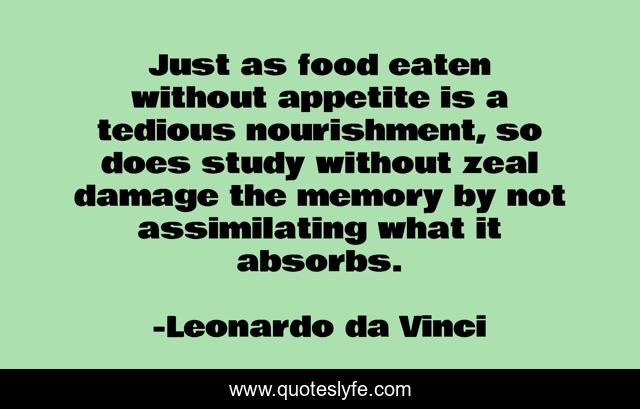 This page presents the quote "Just as food eaten without appetite is a tedious nourishment, so does study without zeal damage the memory by not assimilating what it absorbs.". Author of this quote is Leonardo da Vinci. This quote is about study, without, memory,.