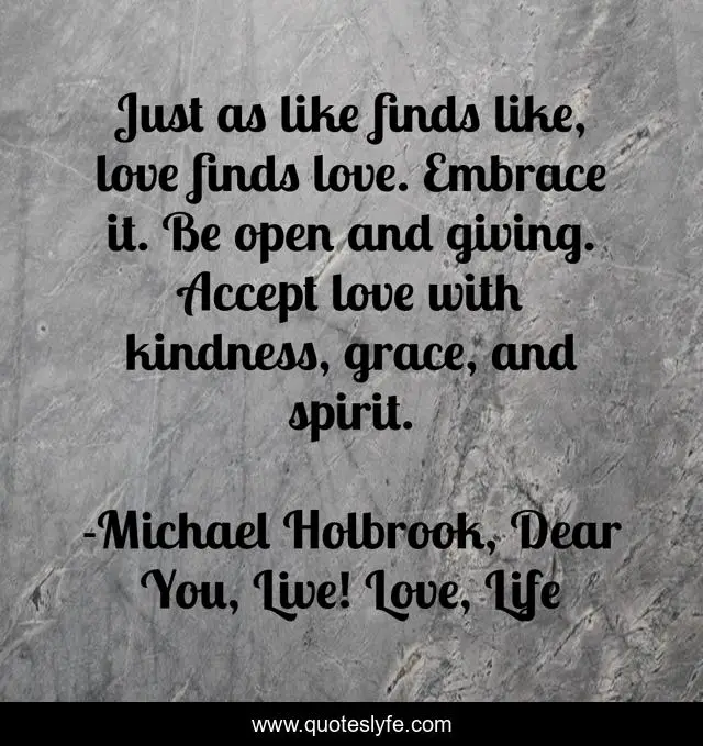 This page presents the quote "Just as like finds like, love finds love. Embrace it. Be open and giving. Accept love with kindness, grace, and spirit.". Author of this quote is Michael Holbrook, Dear You, Live! Love, Life. This quote is about love, guidance, self-worth, inspirational, enthusiasm, affection,.