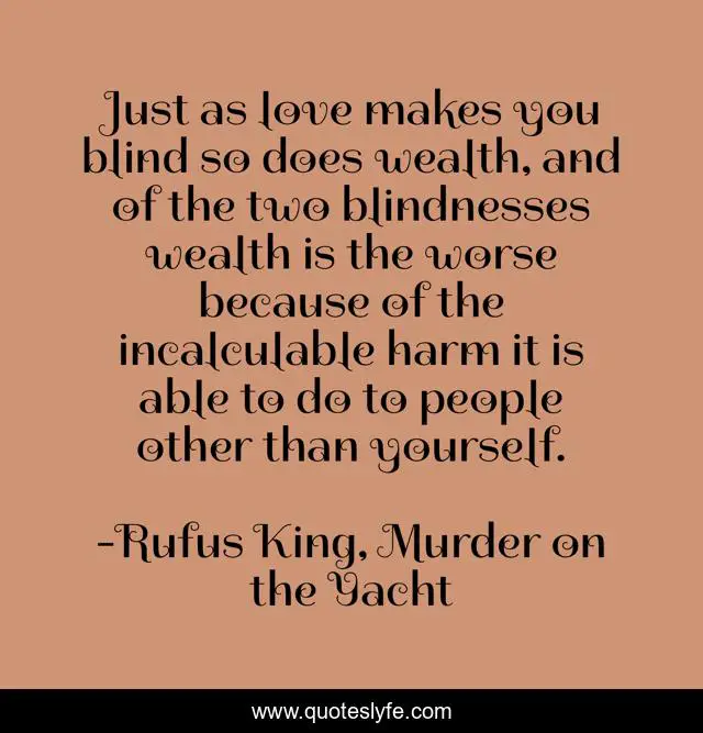 This page presents the quote "Just as love makes you blind so does wealth, and of the two blindnesses wealth is the worse because of the incalculable harm it is able to do to people other than yourself.". Author of this quote is Rufus King, Murder on the Yacht. This quote is about money, wealth,.
