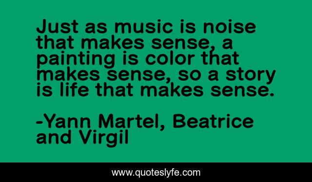 This page presents the quote "Just as music is noise that makes sense, a painting is color that makes sense, so a story is life that makes sense.". Author of this quote is Yann Martel, Beatrice and Virgil. This quote is about story, literature,.