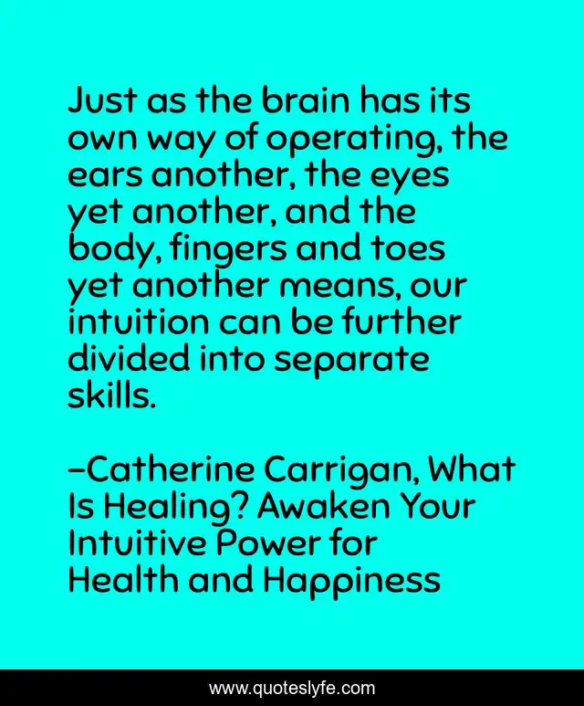 This page presents the quote "Just as the brain has its own way of operating, the ears another, the eyes yet another, and the body, fingers and toes yet another means, our intuition can be further divided into separate skills.". Author of this quote is Catherine Carrigan, What Is Healing? Awaken Your Intuitive Power for Health and Happiness. .