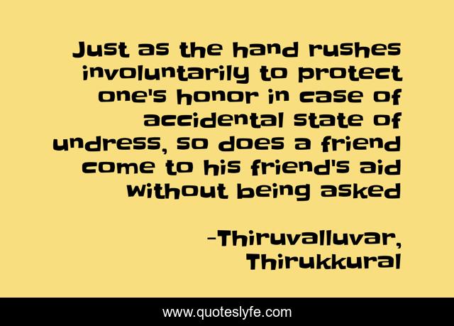 This page presents the quote "Just as the hand rushes involuntarily to protect one's honor in case of accidental state of undress, so does a friend come to his friend's aid without being asked". Author of this quote is Thiruvalluvar, Thirukkural. This quote is about help, friends, protection, aid, friendship, friend,.