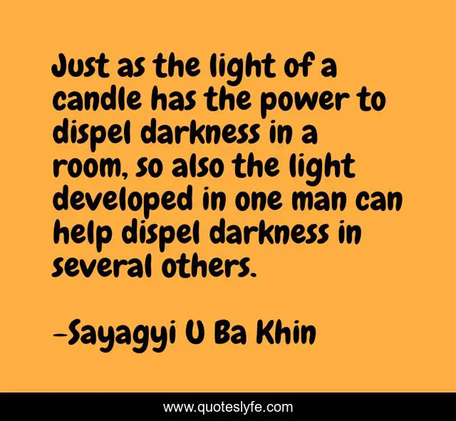 This page presents the quote "Just as the light of a candle has the power to dispel darkness in a room, so also the light developed in one man can help dispel darkness in several others.". Author of this quote is Sayagyi U Ba Khin. This quote is about enthusiasm, spiritual, inspirational,.
