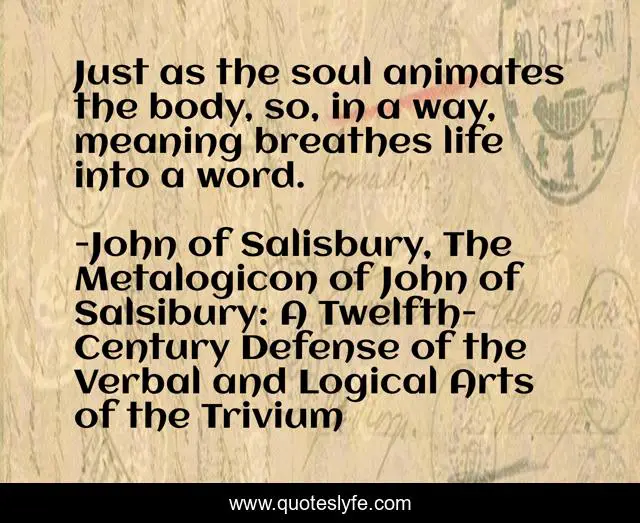 This page presents the quote "Just as the soul animates the body, so, in a way, meaning breathes life into a word.". Author of this quote is John of Salisbury, The Metalogicon of John of Salsibury: A Twelfth-Century Defense of the Verbal and Logical Arts of the Trivium. This quote is about meaning, rhetoric,.