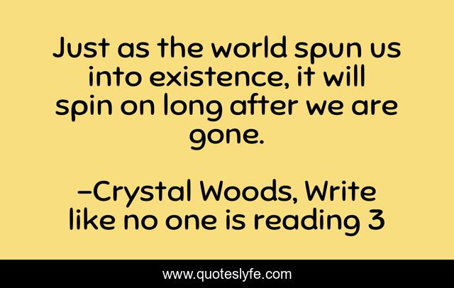 This page presents the quote "Just as the world spun us into existence, it will spin on long after we are gone.". Author of this quote is Crystal Woods, Write like no one is reading 3. This quote is about spun, life, the-world, afterlife, the-end, existence, earth,.