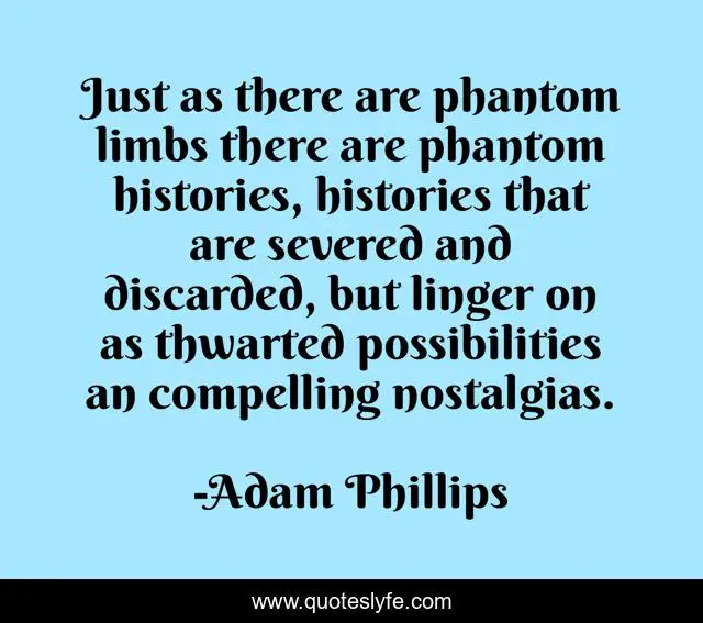 This page presents the quote "Just as there are phantom limbs there are phantom histories, histories that are severed and discarded, but linger on as thwarted possibilities an compelling nostalgias.". Author of this quote is Adam Phillips. This quote is about phantom-histories, history,.