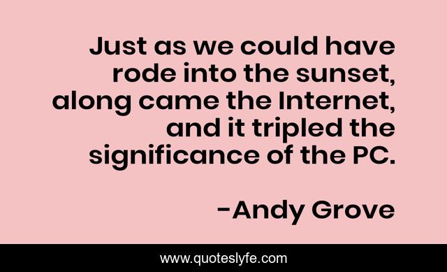This page presents the quote "Just as we could have rode into the sunset, along came the Internet, and it tripled the significance of the PC.". Author of this quote is Andy Grove. This quote is about sunset, just, internet,.