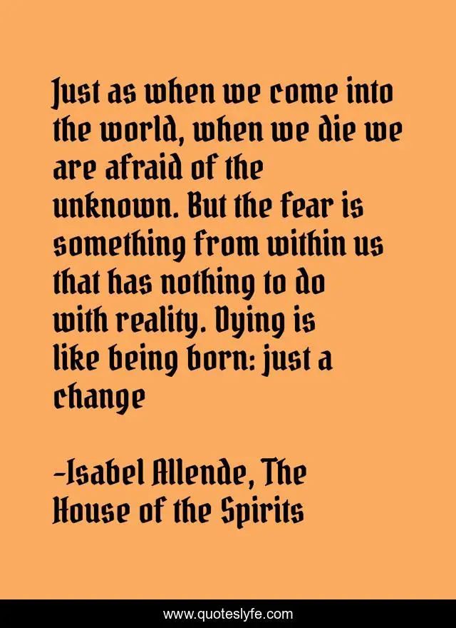 This page presents the quote "Just as when we come into the world, when we die we are afraid of the unknown. But the fear is something from within us that has nothing to do with reality. Dying is like being born: just a change". Author of this quote is Isabel Allende, The House of the Spirits. This quote is about death, changes, reality, born, fear-of-unknown, fear, fear-of-death, death-and-dying, change,.